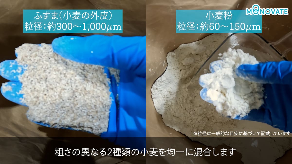 混合結果の評価には、現状の手作業による混合方法(袋に小麦粉とふすまを各500gずつ入れ、空気を含ませて振る)で作成したサンプルを基準としました。