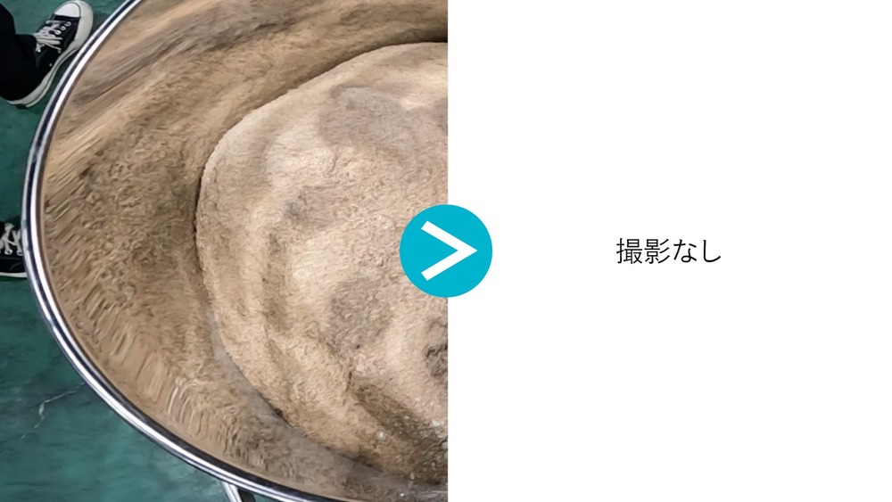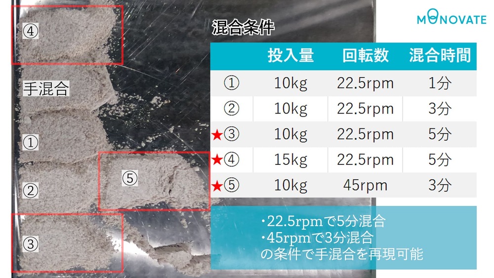 この手混ぜサンプルと、ロータリードラムミキサーで混合した各条件のサンプルを並べ、目視で混ざり具合を比較する方法を用いて確認を行いました。