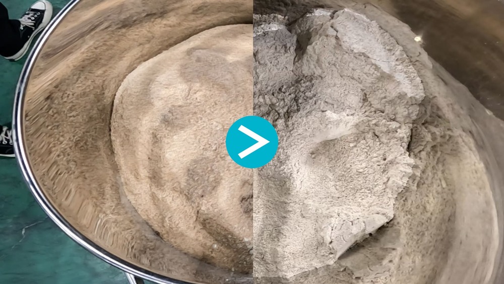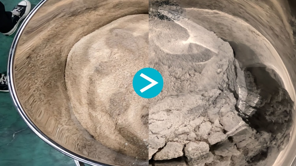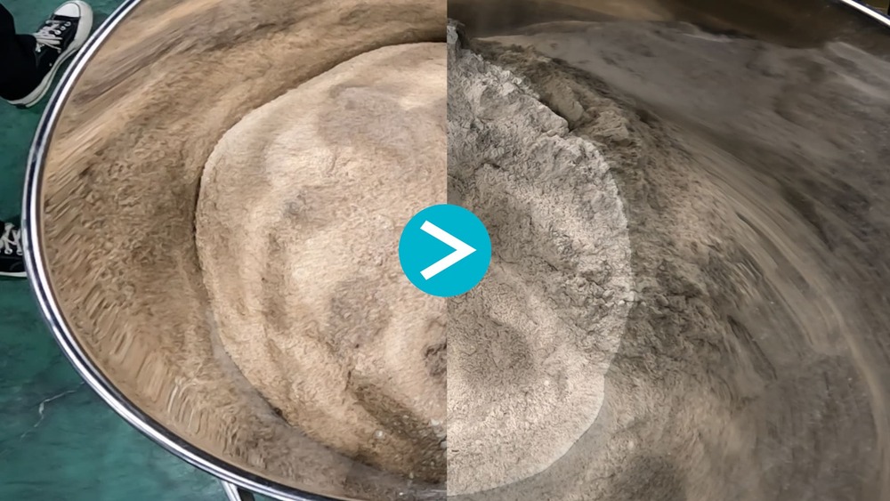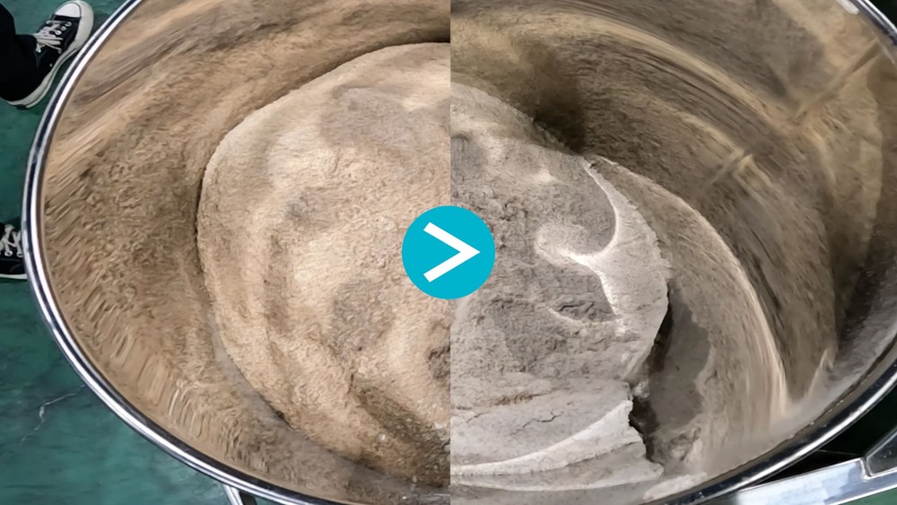 粉体の混合は一見シンプルに見えて、粒度や比重の違いによって意外と難しい作業です。