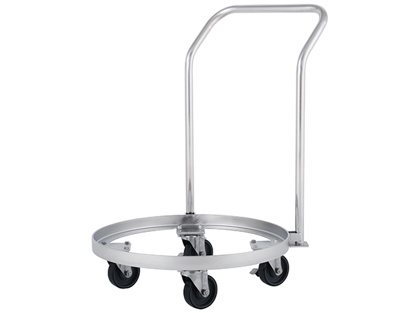 取っ手付きの容器運搬台車を使用すると、腰を屈めず手押し台車のように容器を運搬できます。