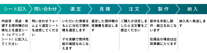 最後に、MONOVATEへお問い合わせいただいた場合の撹拌機購入までの流れを簡単にまとめます。