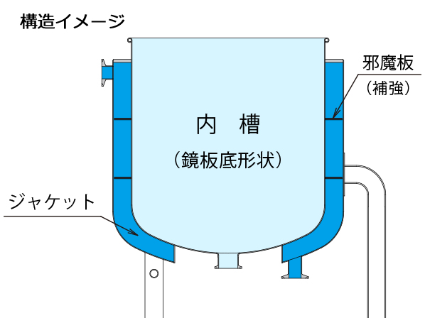 ○内槽は鏡板形状になっている為、液体の攪拌や排出に適しています。