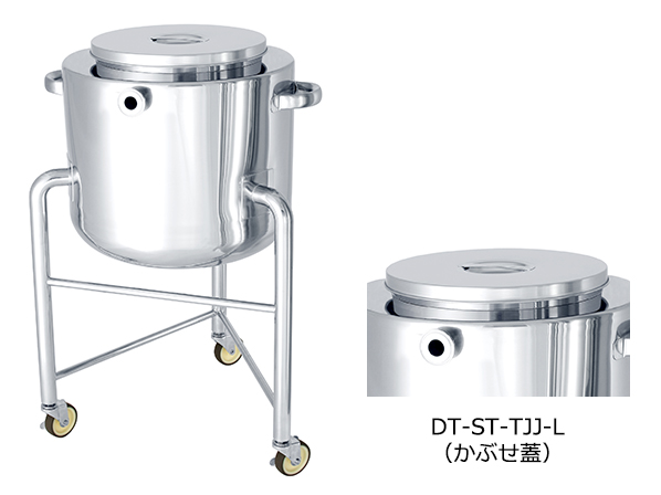 保温・保冷効果を高め火傷や結露の対策ができる、断熱槽付きのジャケット容器内槽は撹拌・排出に優れたお椀形状 ○ジャケット部の外側にグラスウールを閉じ込めた断熱槽を設け、保温・保冷効果を高めています。○通常のジャケット容器に比べて放熱が少なく、周辺温度の変化を抑制し、火傷や結露の対策にもなります。○ジャケット部(外槽)に水を流し、内容物を保温・冷却できます。○ジャケット部のみ、圧力(0~0.18MPa/サイズにより異なる)がかかる際も使用できます。○内槽は、液体の攪拌や排出に適した鏡板形状です。○容器下部の排出口の下には、受け(小分け)用の別容器を置くことができます。○【DT-ST-TJJ-L】はかぶせ蓋タイプ、【DT-CTL-TJJ-L】はレバーバンドで密閉できるタイプです。○受注生産品ですので、内容物や用途に合わせてオーダーメイドできます。
