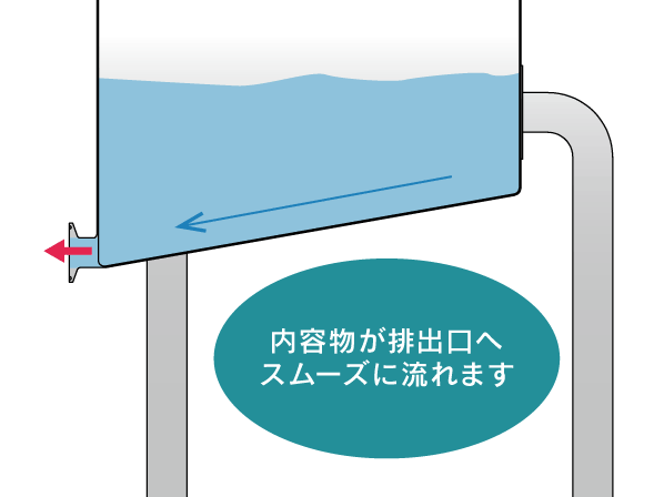 【排出の時短】平底の容器よりスムーズに内容物を次工程に排出できるよう、底面を排出方向に傾斜させました。また、当社従来品より傾斜をきつくすることでより排出効率を向上させています。高粘度の液体にも有効です。