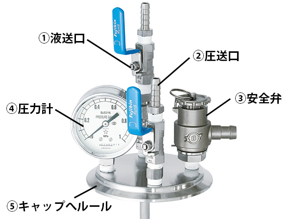 加圧口、液送口、安全弁、圧力計がセットになってます。