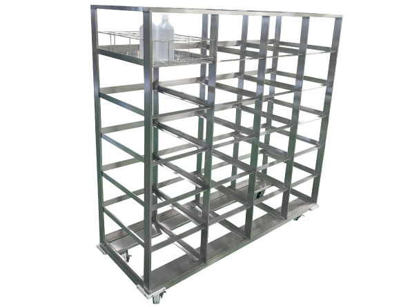 医薬品・研究用ボトルの滅菌処理に。最大1,152本対応のオーダーメイドのステンレス製ラック