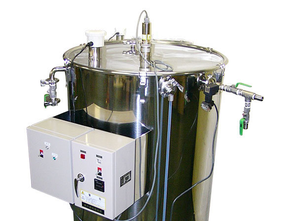 〇純水の貯蔵、殺菌、排出に使用する、ステンレス密閉容器のオーダーメイド事例です。