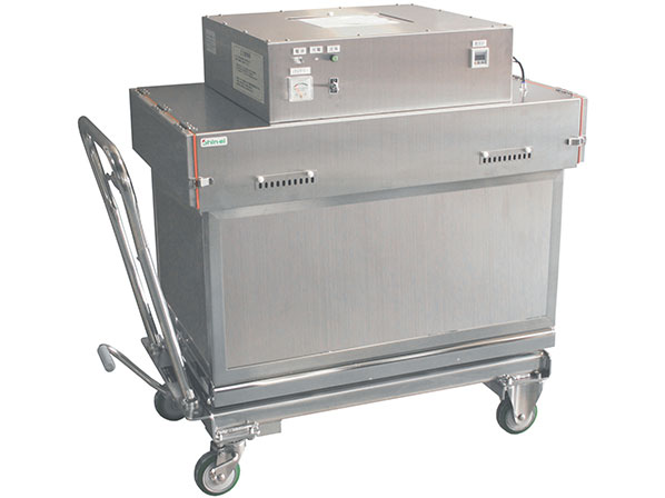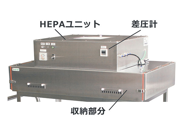 - このHEPAユニットはバッテリー搭載式で、クリーンエアで陽圧保護(グレードA環境を保持)したまま移動できるメリットがあり、無菌環境で充てんした製品(バイアル)を無菌的に搬送する際に使用します。