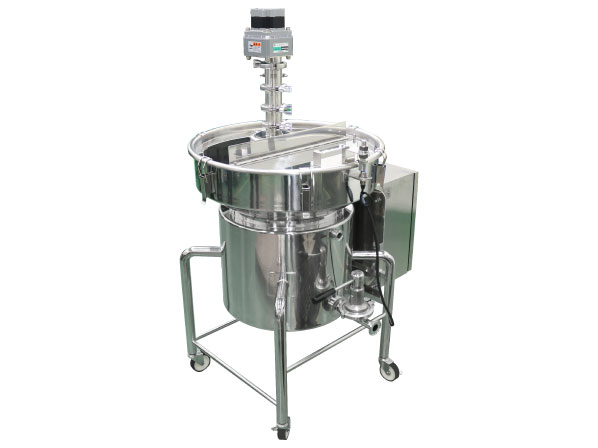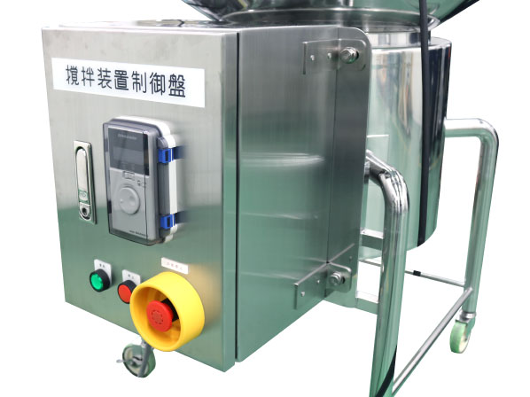 調味液の混合に使用する撹拌温調ユニット。 撹拌機は内容物に合わせたハイパワー仕様、制御盤で回転数等の操作が可能です。 洗浄がしやすいように、シャフトと撹拌体を一体型(隙間がない全周溶接)にしました。