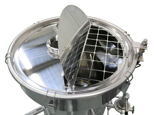 「撹拌機の安全対策が必要」 →投入口に格子網を設置し、回転している撹拌体に手が触れない設計にしました。 格子網が外れている時はセンサにより撹拌機の運転が停止します。