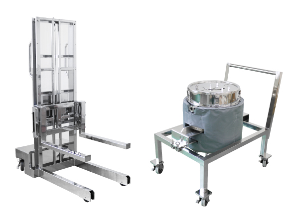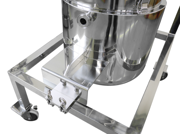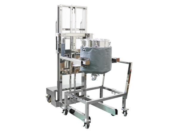 - ジャケットタンクは架台から分離でき、フォークリフトで持ち上げて別のタンクへ液を投入します。